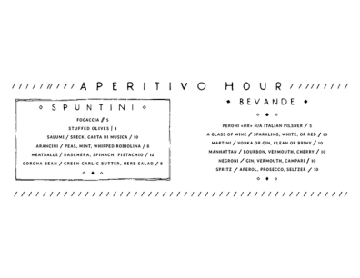 Aperitivo Menu Avaible Everyday between 5-6PM at the bar only.