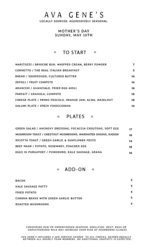 Celebrate Mother's Day with BRUNCH at Ava Gene's! Back for one day only on Sunday, May 10th. Click here to book your reservation.